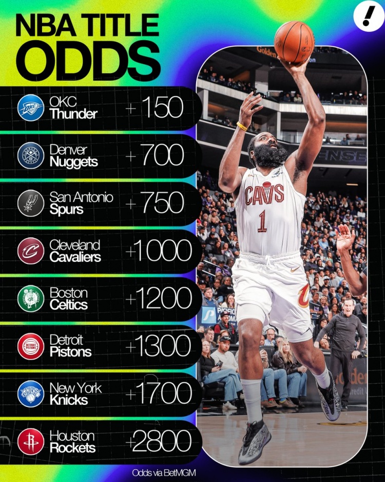 即时比分-夺冠赔率:雷霆+150第1 掘金2&马刺3 骑士+1000第4 火箭+2800第8
